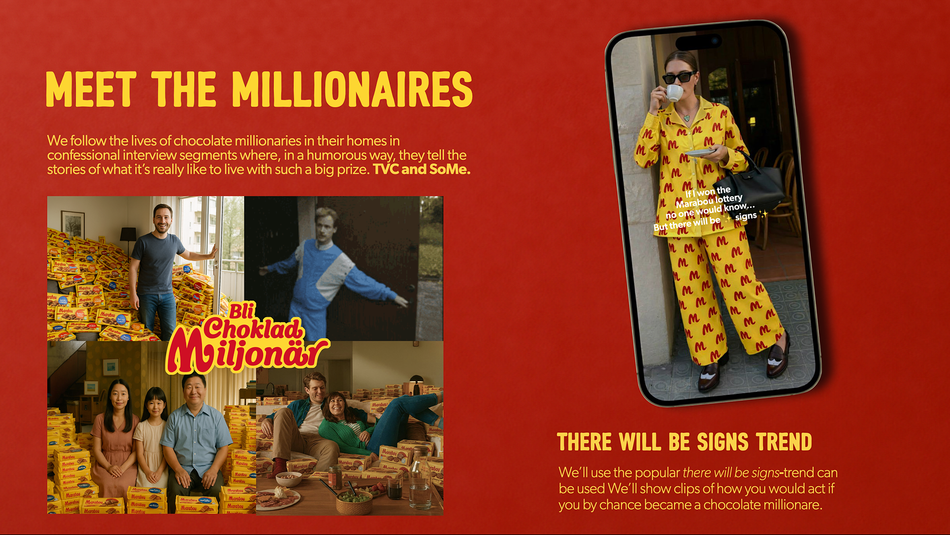 Marabou is not just a small bar of joy. It’s the beginning of something bigger. It’s the one gift that elevates the situation and brings out happiness. It’s the dream of changing your life and everyone around you in a tasty second. By launching the Marabou scratchcard, we make it possible to become a chocolate millionaire. The dream prize: chocolate in a million grams and the chance to share the triumph with others. Because it’s not just a bar, it’s the perfect opportunity for Marabou to give the Swedish people a little more mmm in life.